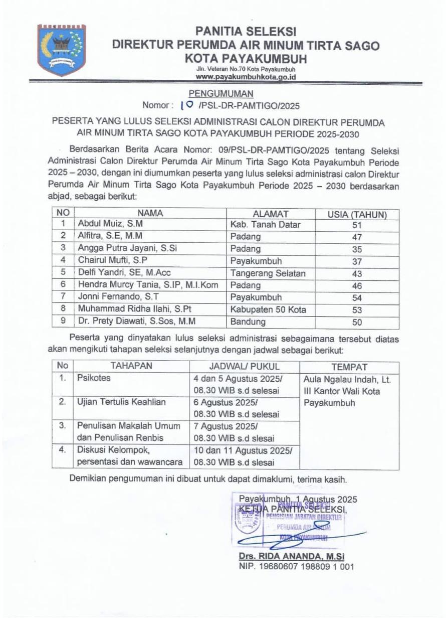 Sebelumnya dalam Surat pengumuman Panitia Seleksi Direktur Perumda Air Minum Tirta Sago Kota Payakumbuh Nomor : 10/PSL-DR-PAMTIGO/2025 tanggal 1 Agustus 2025 disebutkan nama-nama yang lulus seleksi administrasi, mereka Abdul Muiz, SM (51) alamat Kabupaten Tanah Datar, Alfitra, SE. MM (47) Alamat Padang, Angga Putra Jayani, S.SI (35) Padang, Chairul Mufti, SP (37) Payakumbuh, Delfi Yandri (43) Tangerang Selatan, Hendra Murcy Tania, S.IP, M.I. Kom (46) Padang, Jonni Fernando, ST (54) Payakumbuh, Muhammad Ridha Illahi, S.Pt (53) Kabupaten Limapuluh Kota, Dr. Prety Diawati, S.Sos, M.M (50) Bandung.