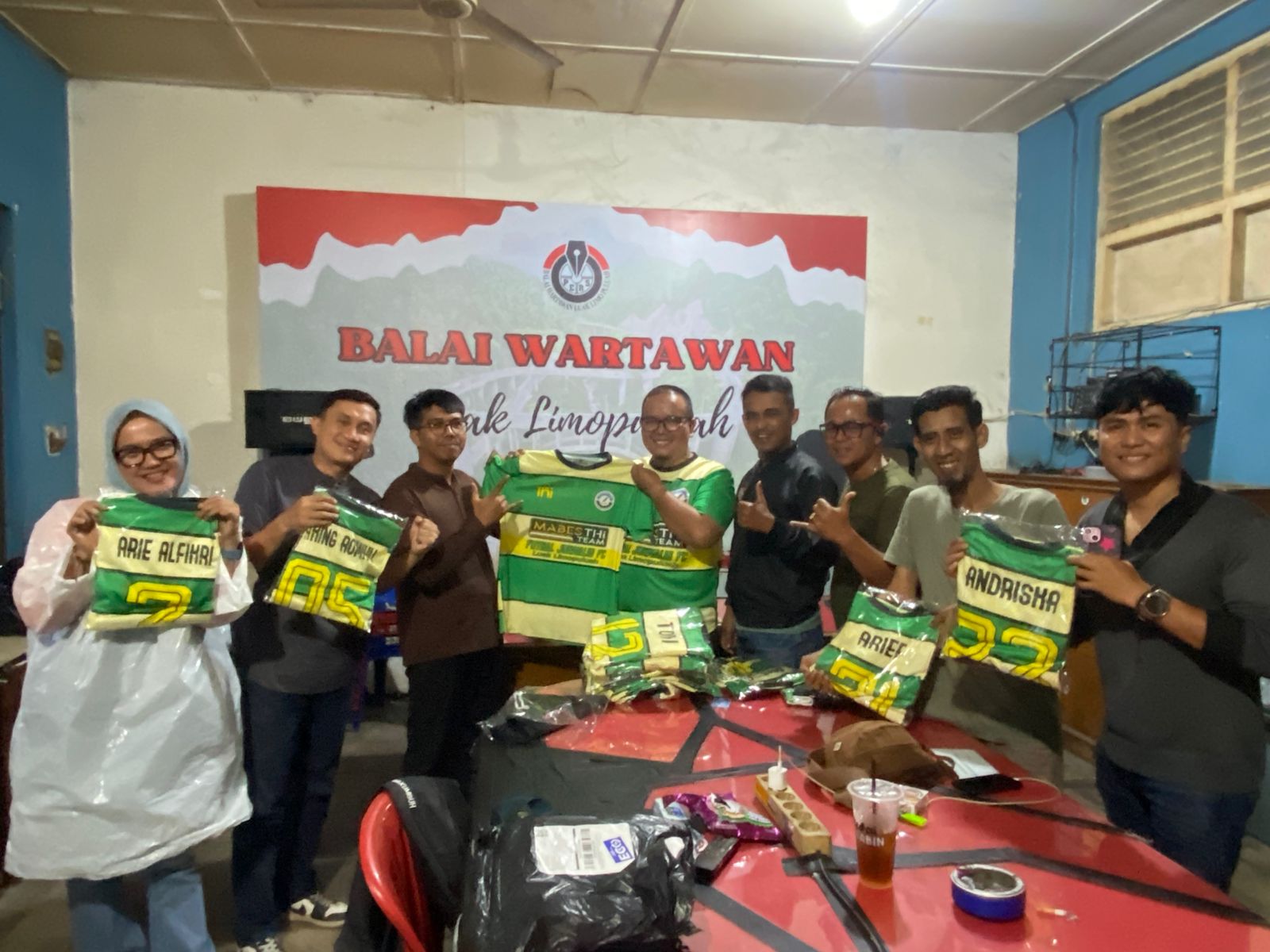 THI tanpa aba-aba mendatangi kantor Balai Wartawan Luak Limopuluah, Jumat (2/1/2026) sore, untuk menyerahkan bantuan sebanyak 20 pasang jersey sepak bola, lengkap dengan celana.