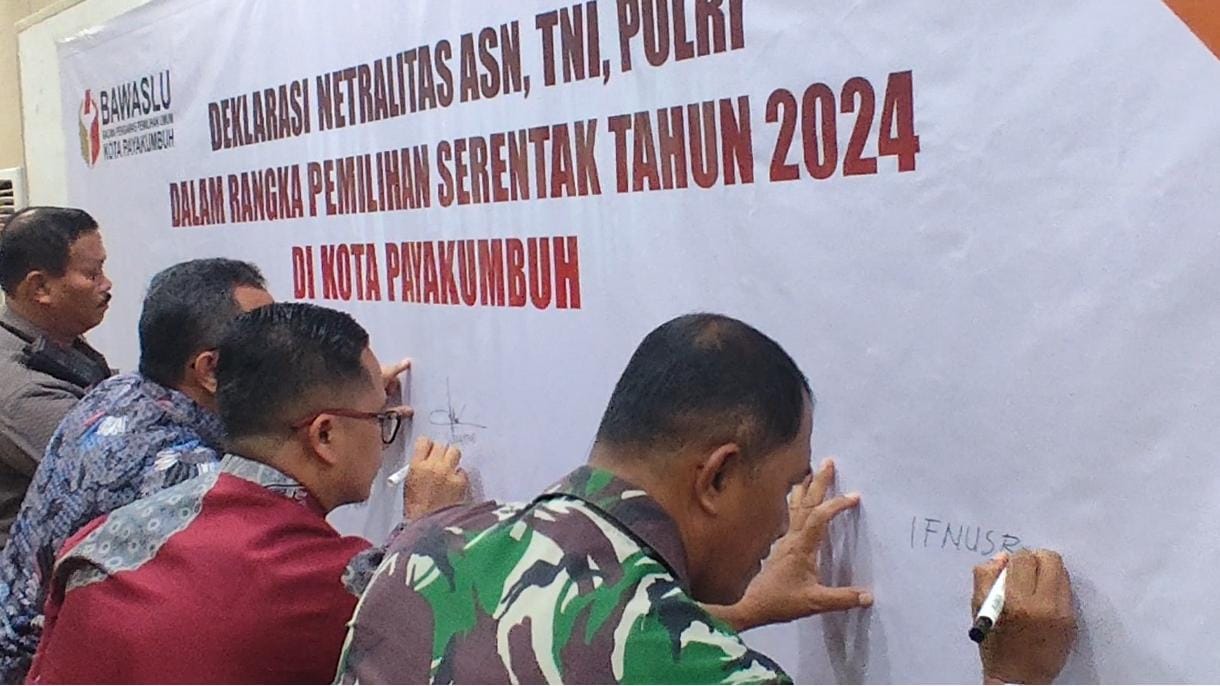 Badan Pengawas Pemilu (BAWASLU) Kota Payakumbuh gelar Deklarasi Netralitas ASN, TNI dan POLRI dalam rangka pemilihan serentak Nasional atau PILKADA Pemilihan Walikota-Wakil Walikota Payakumbuh dan Pemilihan Gubernur-Wakil Gubernur Sumbar tahun 2024, Deklarasi itu digelar dalam kegiatan Rapat Koordinasi (RAKOR) Pengawasan Netralitas ASN, TNI dan POLRI dalam rangka Pemilihan serentak Nasional tahun 2024 di Kota Payakumbuh. Deklarasi itu langsung dihadiri langsung Pj. Walikota Payakumbuh, Suprayitno, Kapolres, Dandim dan sejumlah Kepala OPD.