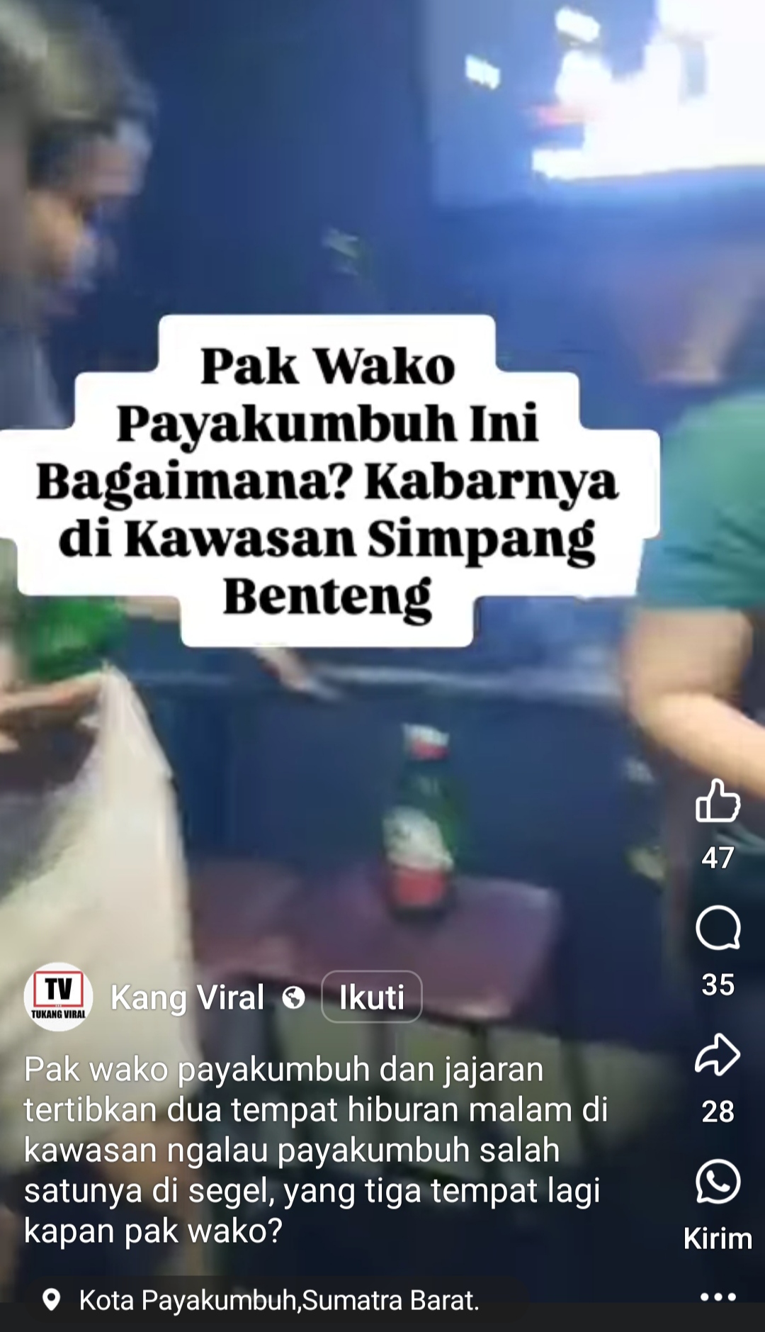 Dalam Postingannya, Kang Viral memposting Video aktivitas diduga didalam room Karaoke diduga di Kawasan Simpang Benteng. Di video itu terlihat sejumlah wanita muda diduga Ladies Companion (LC) tengah asyik berkaraoke sambil menenggak miras, bahkan ada yang teler diduga akibat mabuk miras.