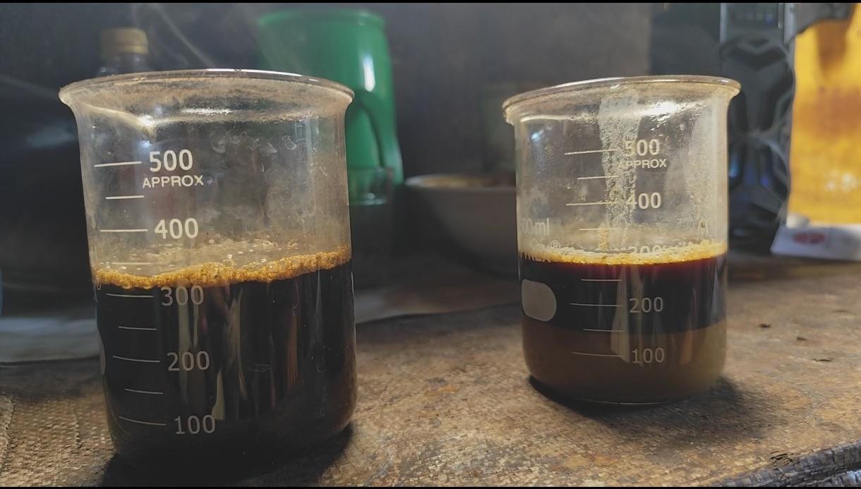 Sementara terkait hasil ujicoba yang dilakukan, untuk Gambir yang dicampur pupuk terlihat sangat tinggi kotorannya.