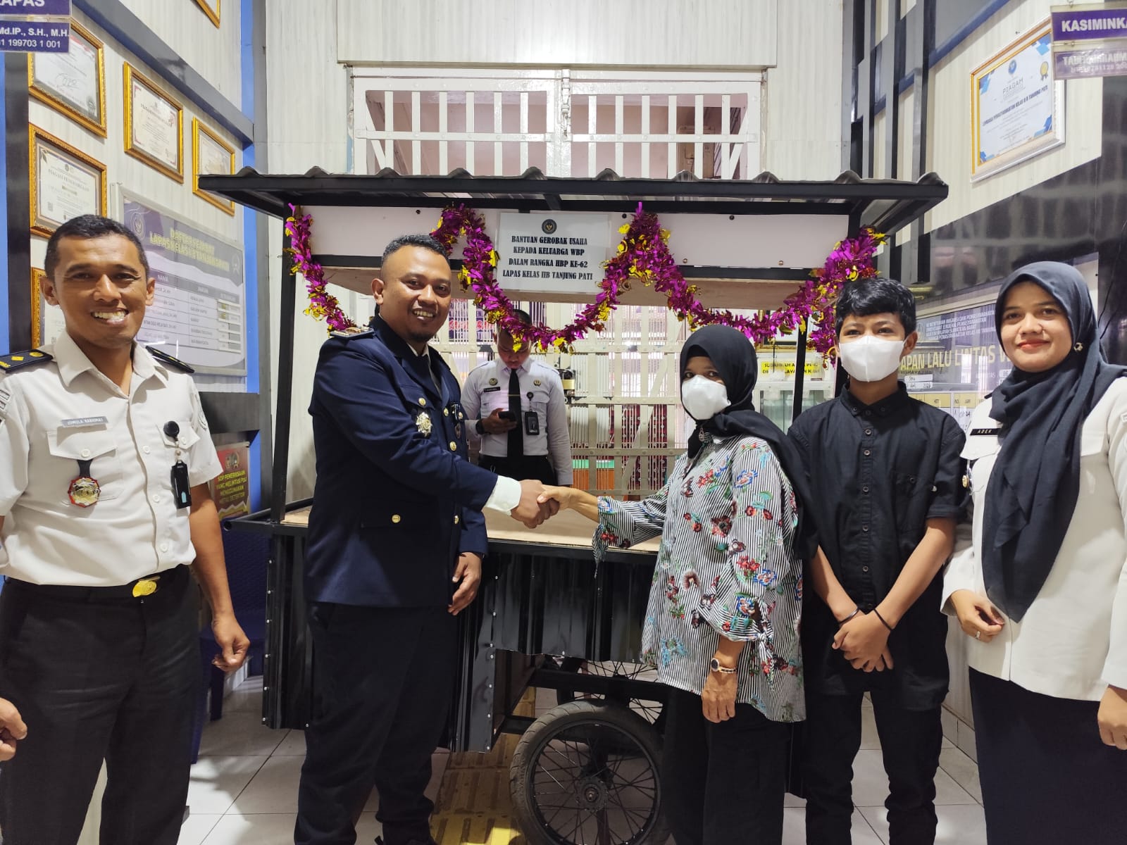 Di Lapas Kelas II B Tanjung Pati, Gerobak bantuan untuk warga Binaan diserahkan Plh. Kalapas Kelas II B Tanjung Pati, Agung Lestara usai Zoom. Penyerahan dilakukan dihalaman Lapas disaksikan pegawai dan keluarga Binaan.