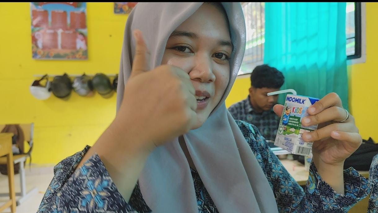 Mutiara, Siswi kelas XII SMA N 1 Harau penerima MBG mengaku menu yang disajikan/diberikan enak, apalagi ditambah susu kotak.