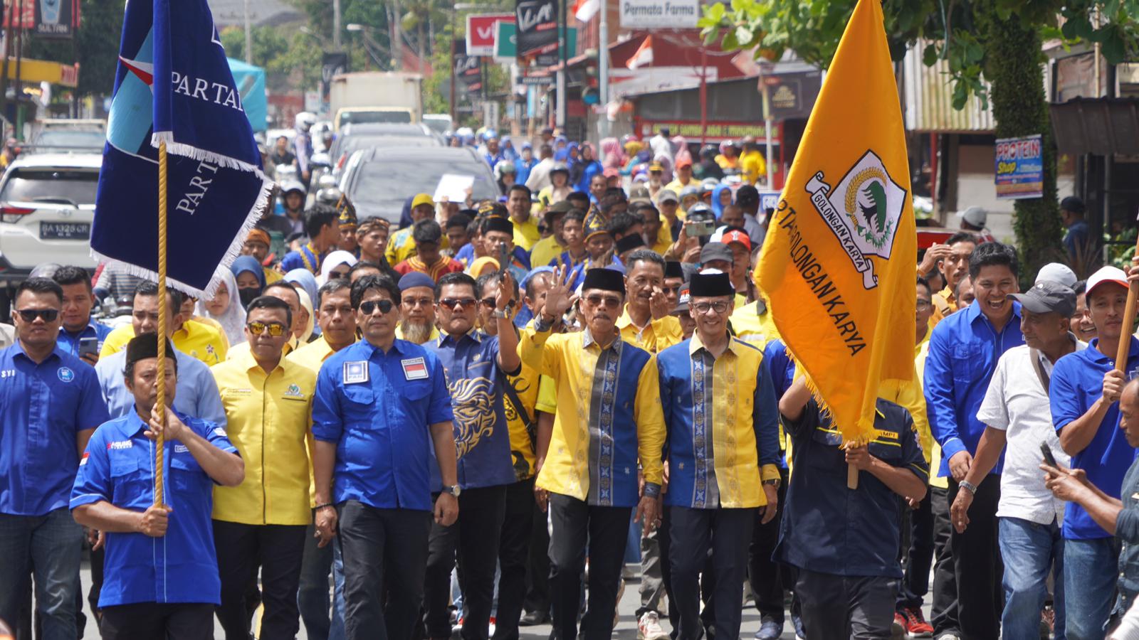 Pasangan yang diusung Tiga Partai Besar Golkar, Demokrat dan PAN itu diantar langsung para Pendukung mengunakan Talempong, Oyak Tabuik dan Qasidah Rabana didampingi ketua DPD Golkar Doni Ikhlas, Ketua DPD PAN, Marsanova Andesra dan Ketua DPC Partai Demokrat Syamsuwirman.