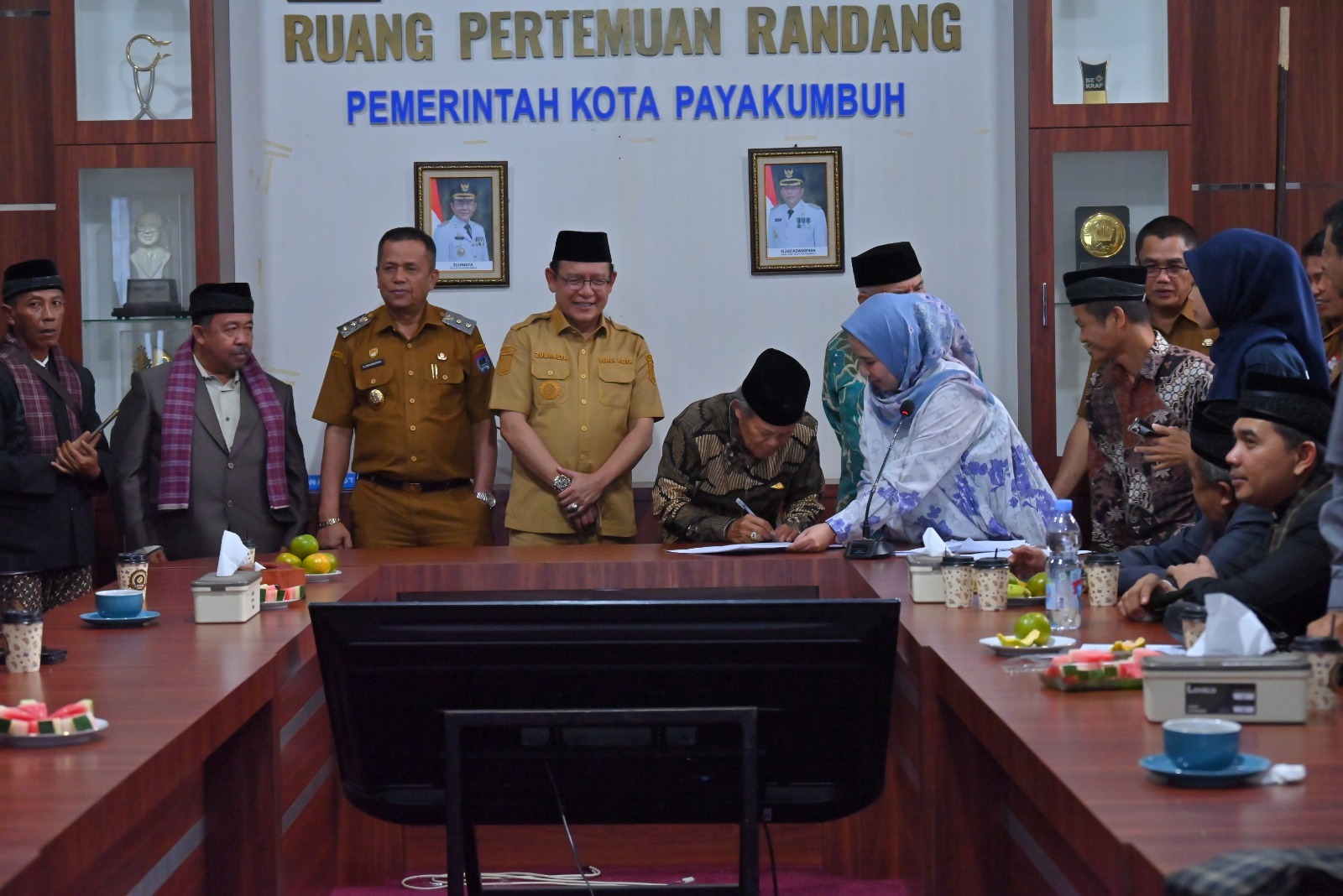 Pemko Payakumbuh bersama niniak mamak Nagari Koto Nan Ompek dan Nagari Koto Nan Gadang menandatangani akta perjanjian pembangunan kembali Pasar Blok Barat di hadapan notaris, di Ruang Randang Balai Kota Payakumbuh, Senin (05/01/2026).