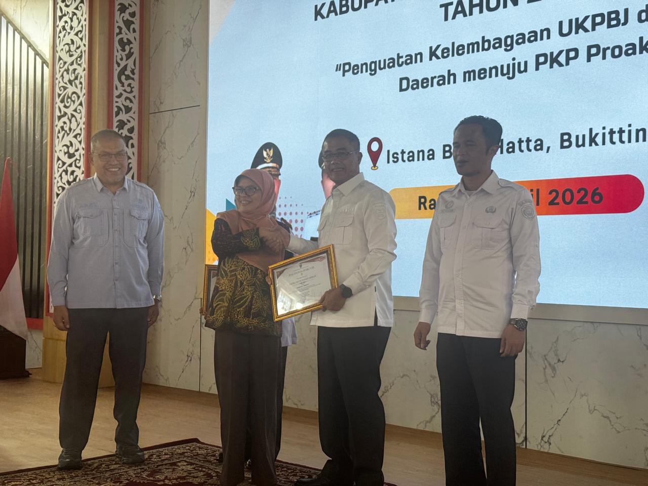 Penghargaan tersebut diserahkan Deputi Bidang Pengembangan dan Pembinaan SDM Pengadaan Barang/Jasa dari LKPP, Suharti, kepada UKPBJ Kota Payakumbuh atas kinerja pengelolaan pengadaan di tingkat daerah.
