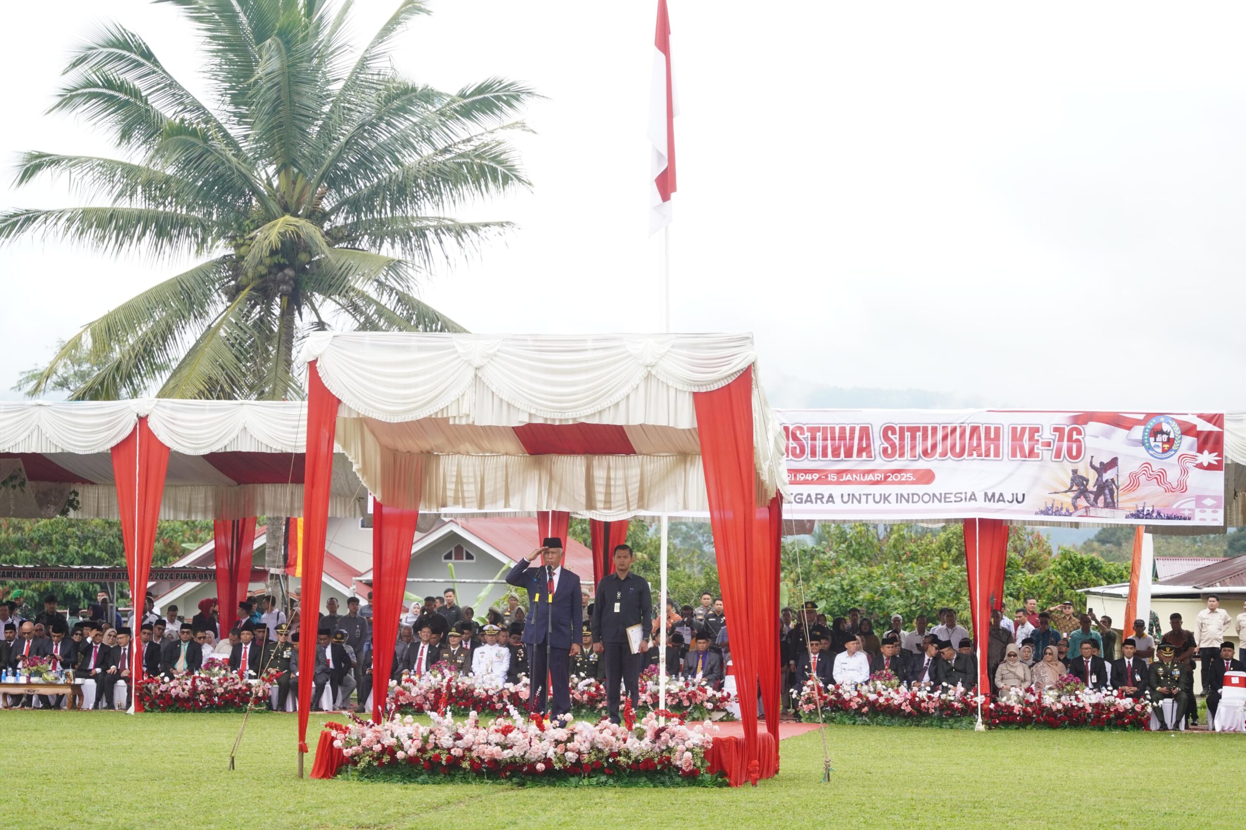 Bupati Limapuluh Kota Safaruddin hadir dalam upacara yang dipimpin Gubernur Sumatera Barat Mahyeldi. Diselenggarakan d Lapangan Chatib Sulaiman, Situjuah Batua, Kabupaten Limapuluh Kota, Rabu 15 Januari 2024.