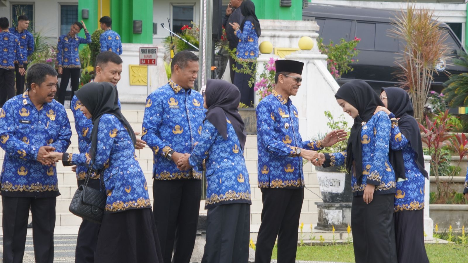 Selesai apel dilaksanakan prosesi pamitan, dimana seluruh peserta apel gabungan bersalaman dengan Bupati Safaruddin dan disini tergambarkan dengan jelas raut kesedihan di wajah semua peserta apel gabungan. (Edw/Rel)