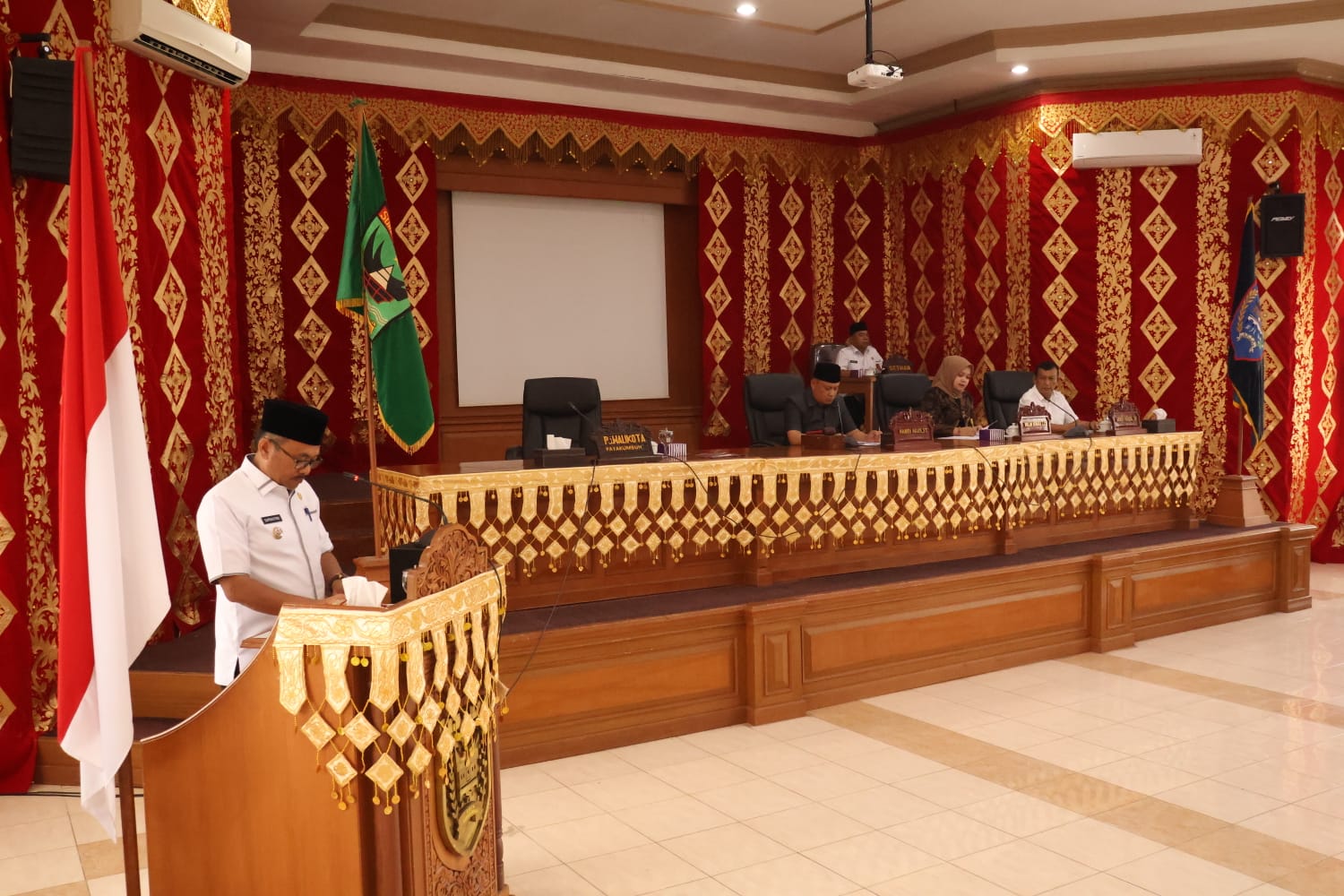 Pj. Walikota Payakumbuh menyampaikan nota keuangan Rancangan Perubahan APBD Kota Payakumbuh tahun anggaran 2024 dalam Rapat Paripurna di Gedung DPRD Kawasan Koto Nan IV, Rabu 14 Agustus 2024.