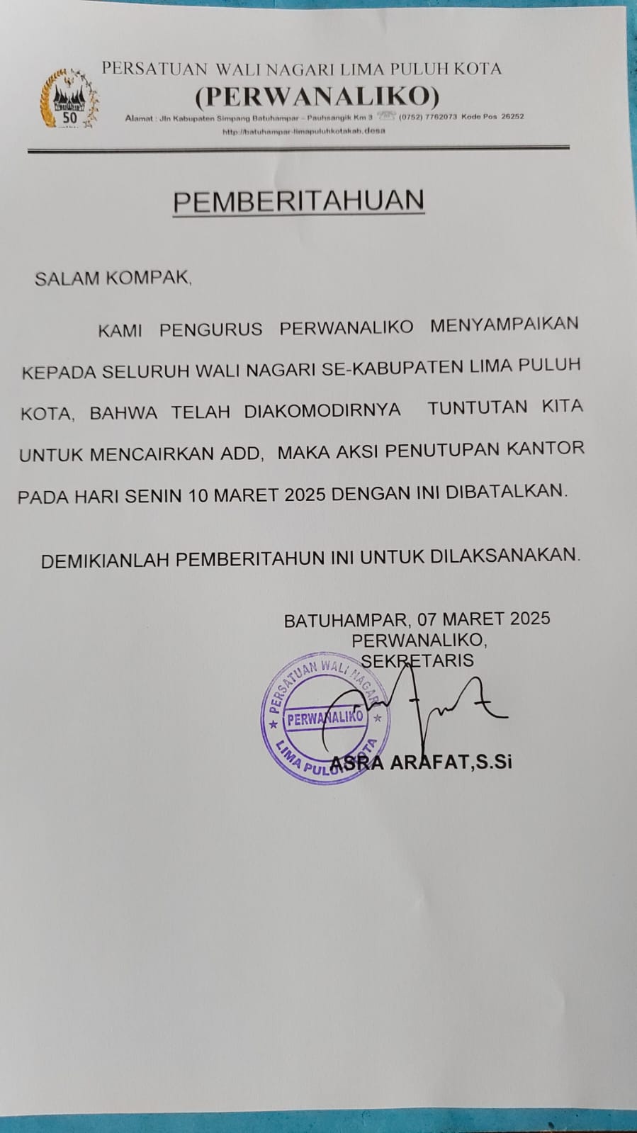 ” Sudah, sudah ada surat Pemberitahuan terbaru yang disampaikan kepada seluruh Walinagari bahwa dengan telah diakomodirnya tuntutan Walinagari terkait dana ADD atau Anggaran Dana Desa, maka rencana penutupan Seluruh Kantor Walinagari pada 10 Maret nanti kita batalkan,” tambahnya.