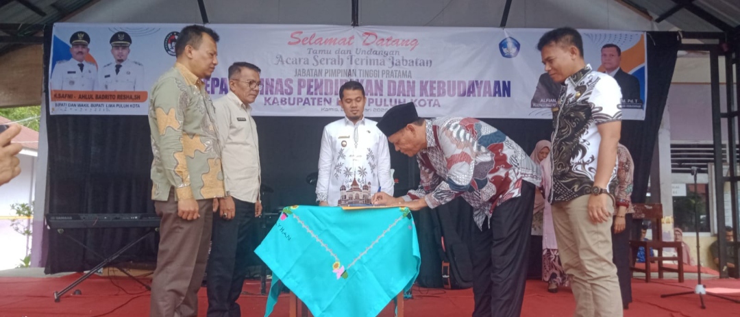 Wakil Bupati Limapuluh Kota, Ahlul Badrito, menghadiri serah terima jabatan Kepala Dinas Pendidikan dan Kebudayaan (Kadisdikbud) Kabupaten Limapuluh Kota dari Pelaksana Tugas (Plt) Alfian, STP kepada Antoni, S.Pd., M.Pd. Kegiatan berlangsung di halaman SMP Negeri 1 Kecamatan Harau, Kamis 29 Januari 2026.