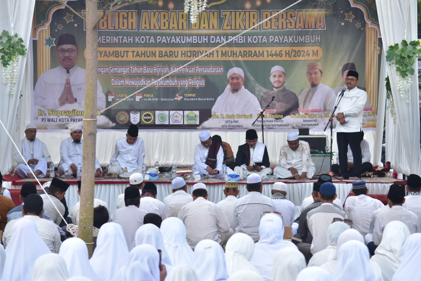 Penjabat (Pj) Wali Kota Payakumbuh Suprayitno menghadiri tabligh akbar dan dzikir bersama dalam rangka menyambut Tahun Baru Hijriah 1 Muharram 1446 H di Halaman Balai Kota Payakumbuh, Sabtu 6 Juli 2024.